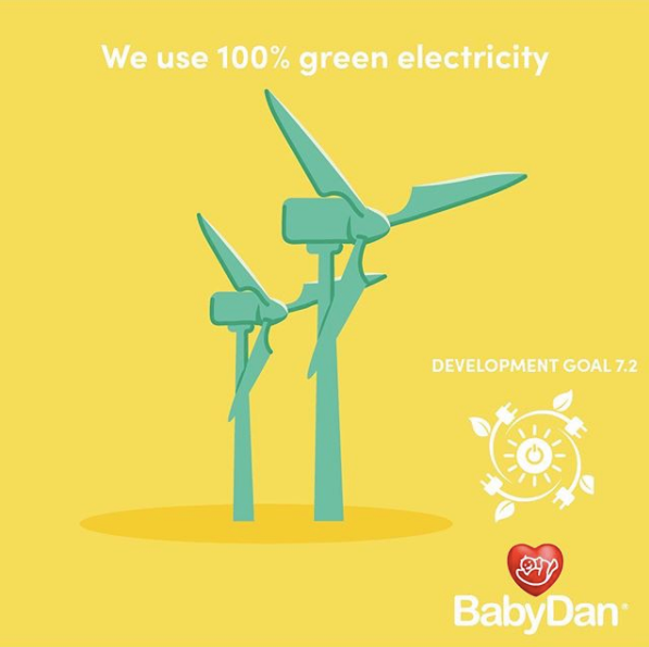 Under mål 7 har vi på BabyDan fokuserat på delmål 7.2 som handlar om att öka den globala andelen förnybar energi. Vi investerar i förnybar energi genom att använda 100 % klimatvänlig el från danska vindkraftverk och vi har LED-belysning i hela produktionen.
