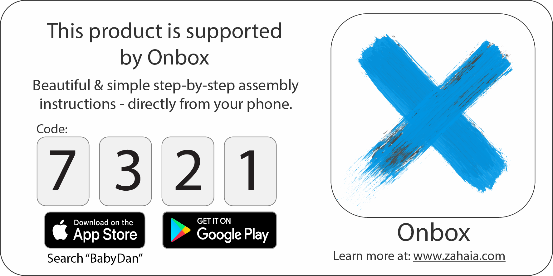 När du köper en BabyDan-grind får du en kod till vår Onbox-app, där du hittar detaljerade instruktionsvideor om hur du monterar alla våra grindar. Guiderna är lätta att förstå och du kan följa installationen steg för steg i din egen takt.